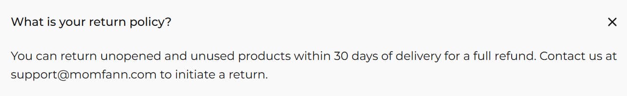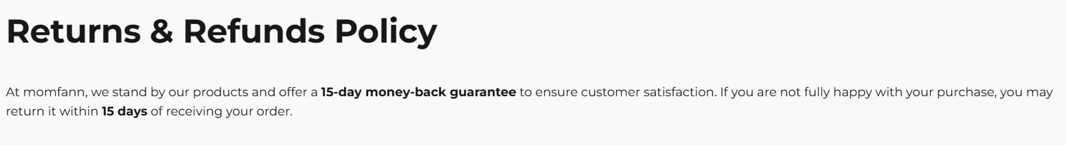 But the dedicated Returns & Refunds Policy says Momfann offers a 15-day money-back guarantee, with returns initiated within 15 days of receiving the item, and that products must be unused, undamaged, and in original packaging.