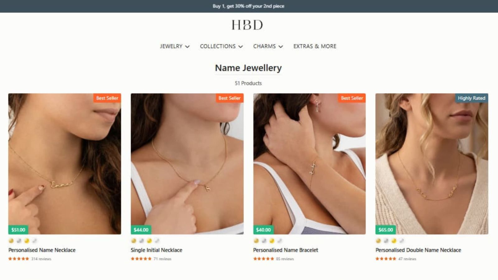 On HBD’s live site, Personalised Double Name Necklace currently shows 5.0/5 from 47 reviews, while Double Name with Heart Necklace shows 4.98/5 from 43 reviews on the homepage. That makes the double-name route one of the clearest high-confidence gift paths in the live catalogue.