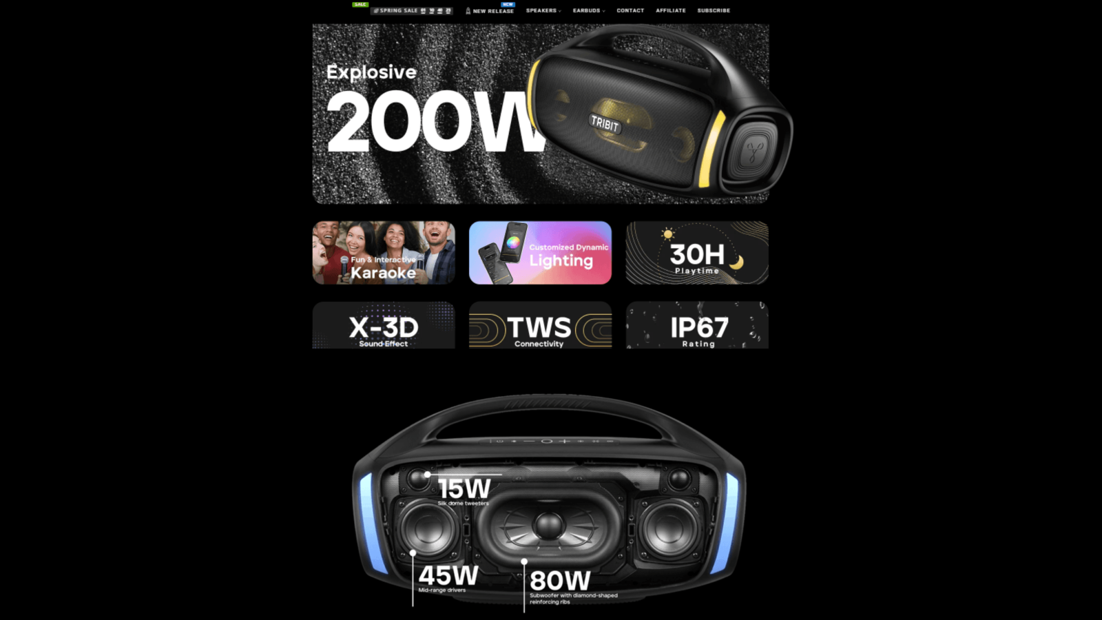 Tribit’s homepage currently highlights a spring-themed campaign built around portable speakers, earbuds, and everyday listening.